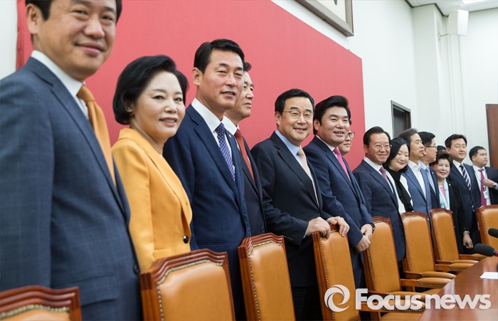 (서울=포커스뉴스) 원유철(왼쪽 여섯번째) 새누리당 대표최고위원 권한대행을 비롯한 원내지도부가 2일 오전 서울 여의도 국회에서 열린 마지막 원내대책회의에 앞서 기념촬영을 하고 있다.