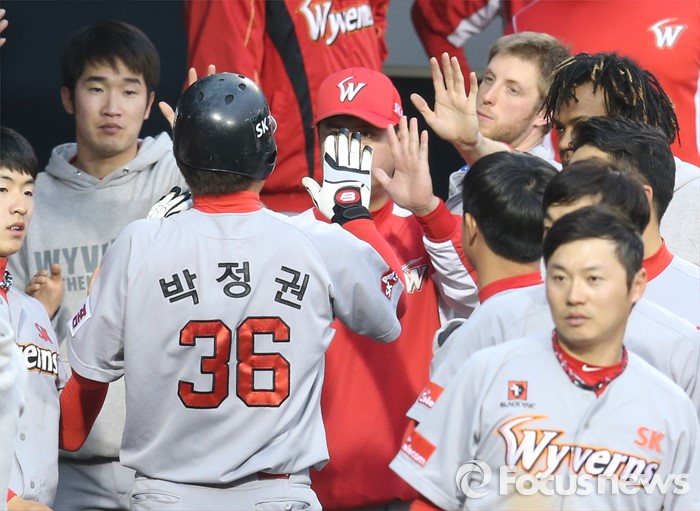 (서울=포커스뉴스) 26일 서울 잠실구장에서 열린 2016 프로야구 SK-두산 경기 2회초 1사후 SK 김성현의 중전안타로 득점한 3루주자 박정권이 덕아웃에서 동료들의 환영을 받고 있다.