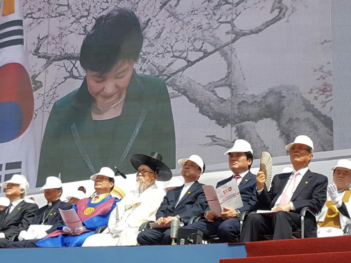 이날 오후 2시 서울 마포구 월드컵경기장에서 열린 원불교 100주년 기념 대회에는 원유철 대행·김무성 전 대표를 비롯해 김종인 더민주 비상대책위원회 대표·안철수·천정배 국민의당 공동대표·심상정 정의당 대표·박원순 서울시장·정세균 더민주 의원·주호영 무소속 의원 등 정계 인사들이 대거 출동했다.