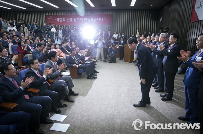 (서울=포커스뉴스) 26일 오전 서울 여의도 국회에서 열린 새누리당 20대 총선 당선자 워크숍에 참석한 최경환 당선인과 경북 지역 당선인들이 인사하고 있다.