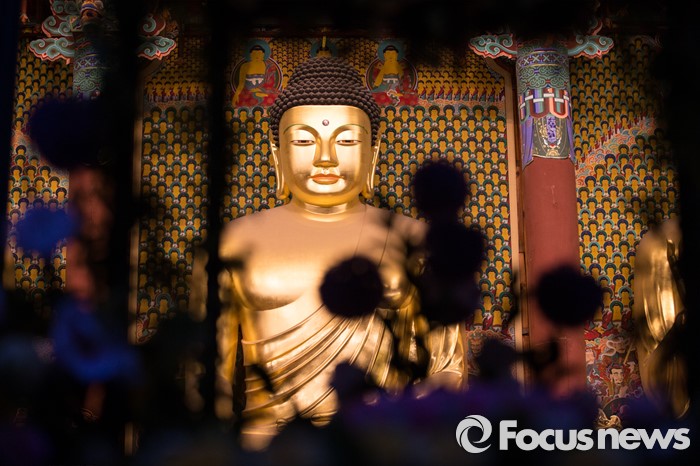 (서울=포커스뉴스) 부처님오신날을 앞두고 26일 밤 서울 종로구 견지동 조계사 대웅전에서 부처님의 얼굴이 보이고 있다.