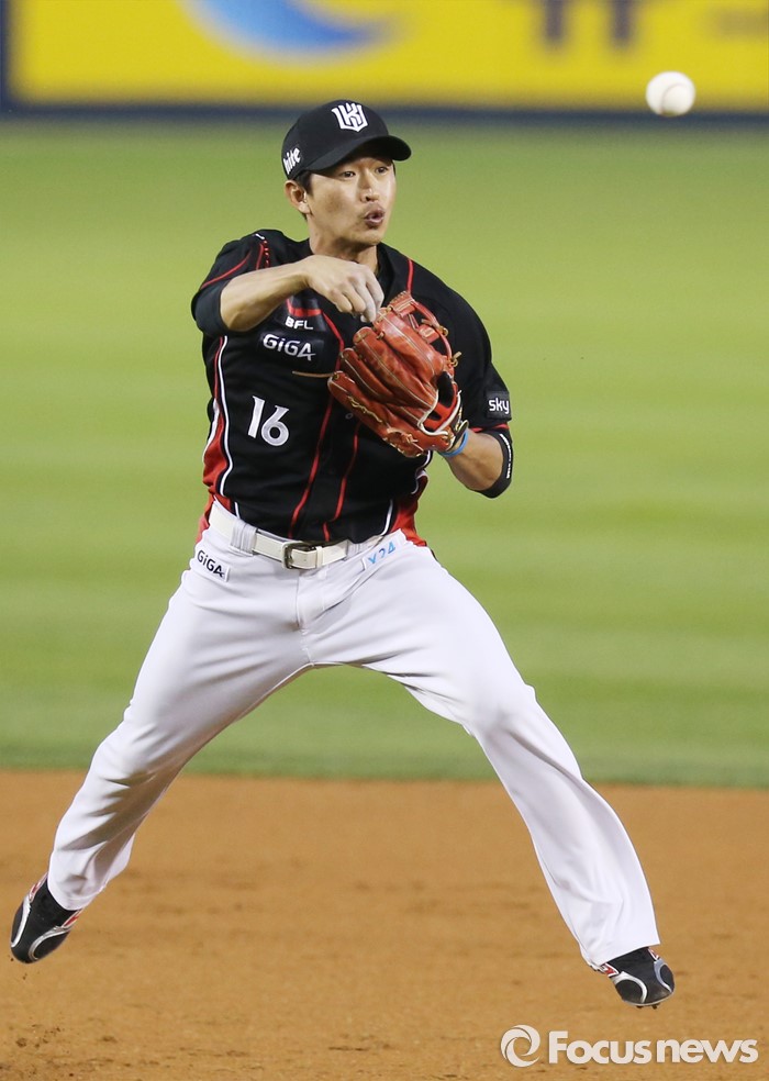 (서울=포커스뉴스) 29일 서울 잠실구장에서 열린 2016 프로야구 kt-LG 경기 3회말 2사후 kt 유격수 박기혁이 LG 정성훈의 땅볼 타구를 잡아 1루로 송구하고 있다.