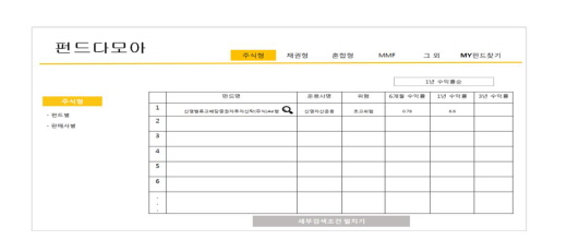 펀드 유형별(주식형, 채권형, 혼합형, MMF 등)로 최근 1년 수익률이 가장 높은 30개 펀드가 순차적으로 정렬되어 노출되는 비교공시전용 웹페이지(가칭 펀드다모아)를 개설할 예정이다.