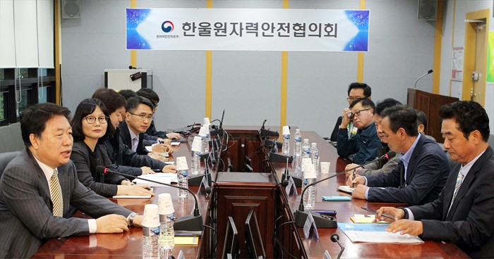 (서울=포커스뉴스) 김용환 원자력안전위원회 위원장이 27일 한울원자력본부 제1발전소 회의실에서 한울원자력안전협의회 위원들과 간담회를 나누고 있다. 김 위원장은 지난 15일 취임해 고리원자력안전협의회를 시작으로 지역주민과의 소통을 강조하며 각 지역 원자력안전협의회 위원들과 소통 행보를 이어갔다. <사진제공=원자력안전위원회>