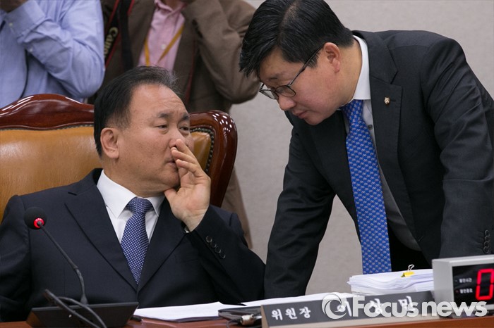 (서울=포커스뉴스) 이상민(왼쪽) 법사위원장과 전해철 야당 간사가28일 오후 서울 여의도 국회 법제사법위원회 전체회의장에서 논의하고 있다.