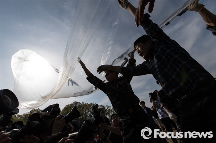 (파주=포커스뉴스) 29일 오후 경기 파주 낙하IC 인근에서 탈북자단체인 자유북한운동연합이 북한에 핵과 미사일을 포기하고 국제사회 일원으로 참여할 것을 촉구하는 내용의 대북전단을 날려보내기 위해 수소가스를 주입하고 있다.