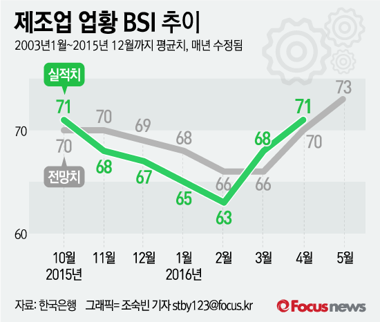 29일 한국은행이 낸 ‘2016년 4월 기업경기실사지수(BSI) 및 경제심리지수(ESI)’에 따르면 올해 4월 제조업의 업황 기업경기실사지수(BSI)는 71로 전달보다 3포인트 상승했다.