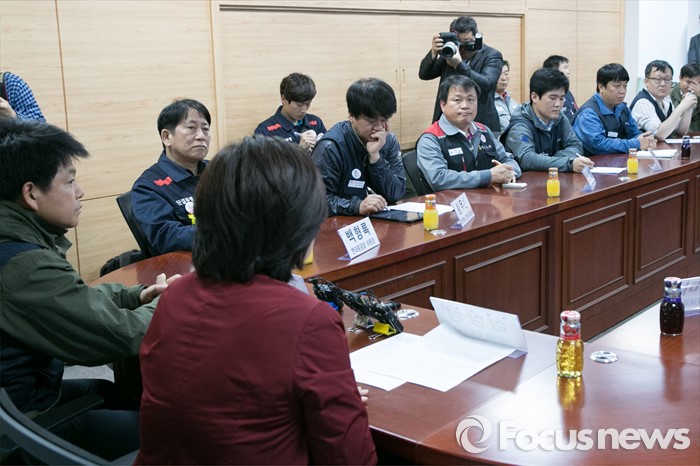 (서울=포커스뉴스) 심상정(앞줄 오른쪽 뒷모습) 정의당 대표가 27일 오후 서울 여의도 국회 의원회관에서 조선업종 구조조정 긴급현안 간담회에 참석해, 모두발언하는 동안, 조선업계 노조 대표들이 경청하고 있다.