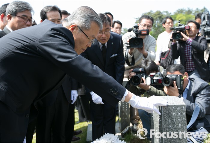 | △ 열사 묘비 만지는 김종인 |