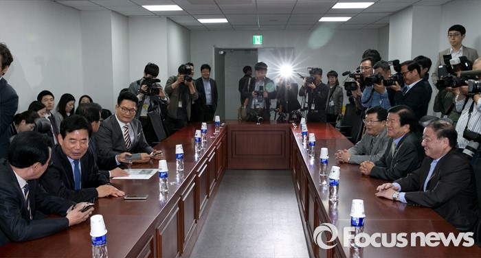 (서울=포커스뉴스) 29일 오전 서울 여의도 국회 의원회관에서 전당대회 연기론 등 논의를 위해 진행된 더불어민주당 4선 이상 중진모임에 참석한 의원들이 대화하고 있다. 이날 모임에는 강창일, 변재일, 이상민, 안민석, 설훈, 박병석, 오제세, 이상민, 문희상 의원과 김진표, 송영길 당선인 등이 참석했다.