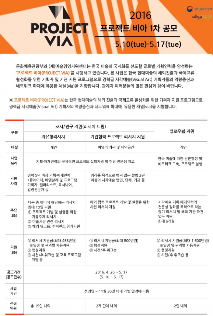 '프로젝트 비아'는 예술경영지원센터와 문화체육관광부가 함께 추진 중인 사업으로 한국 현대미술의 해외진출과 국제교류 활성화를 위한 기획자 지원 프로그램이다. 경력급 시각예술(Visual Art) 기획자들의 역량증진과 네트워크 확대에 유용한 채널(Via)을 지향한다.