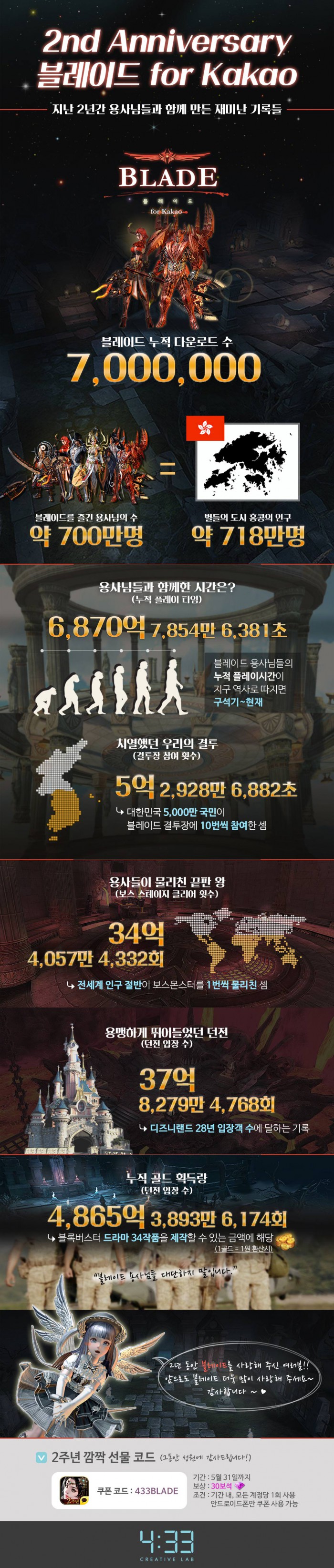 보다 자세한 사항은 블레이드 for Kakao 공식카페(cafe.naver.com/blade433)에서 확인할 수 있다.'블레이드 for Kakao' 출시 2주년 기념 인포그래픽 <사진제공=4:33>