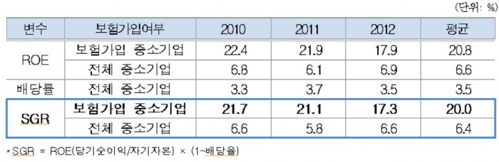 28일 충주 기업은행 연수원에서 열린 신용보증기금 창립 40주년 기념 '신용보험 40 리더스포럼'에서 최창희 보험연구원 박사는 "매출채권보험이 중소기업의 지속성장 가능성을 높인다"며 "보험을 가입한 중소기업의 지속가능성장률(SGR: Sustainable Growth Rate)이 전체 중소기업 대비 13.6%포인트 높다"고 설명했다. 지속가능성장률은 기업이 추가적인 자본의 투입 없이 지속적으로 성장할 수 있는 지를 측정하는 지표이다.