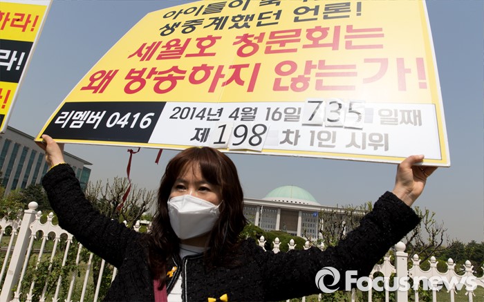 (서울=포커스뉴스) 25일 오전 서울 여의도 국회의사당 정문 앞에서 4월 16일의 약속국민연대 관계자들이 세월호 진상규명 특별법 개정 및 특검 실시 촉구 기자회견을 하고 있다.