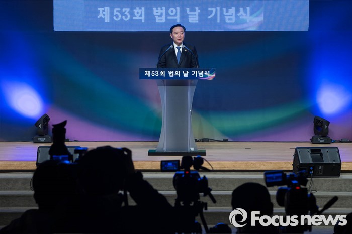 (서울=포커스뉴스) 김현웅 법무부장관이 25일 오전 서울 서초구 대검찰청에서 열린 제53회 법의날 기념식에서 기념사를 하고 있다.