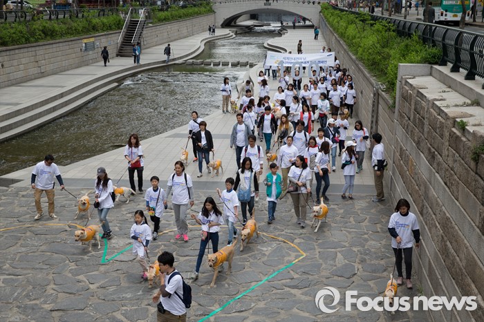 (서울=포커스뉴스) 27일 오전 서울 청계천에서 삼성화재안내견학교 훈련사들과 안내견들이 시민들과 함께 '안내견과의 만남' 행사를 하고 있다.