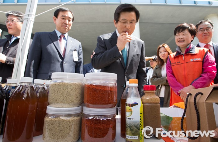(세종=포커스뉴스) 황교안 국무총리가 26일 오전 세종시 정부세종청사 국토교통부 내 광장에서 열린 국무총리실과 1사 1촌 자매결연을 맺은 충주 재오개마을 농·특산물 직거래 장터에 방문해 특산품 맛을 보고 있다.