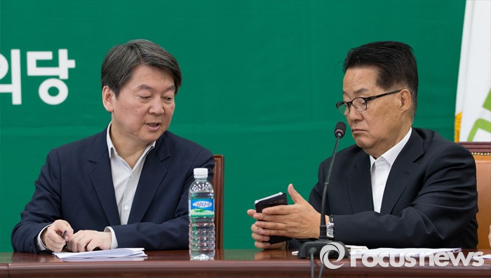 (서울=포커스뉴스) 박지원(오른쪽) 29일 오전 서울 여의도 국회에서 최고위원회의에 참석해 안철수 상임공동대표에게 휴대폰으로 무언가를 보여주고 있다.