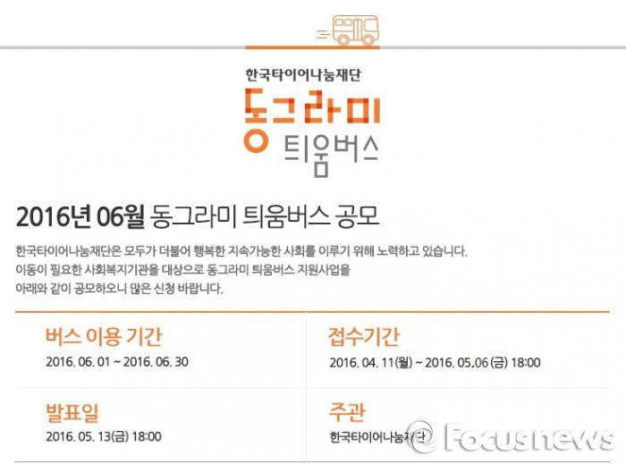 (서울=포커스뉴스) 한국타이어는 나눔재단에서 시행하는 '동그라미 틔움버스' 6월 공모를 다음달 6일까지 접수 받는다고 26일 밝혔다.