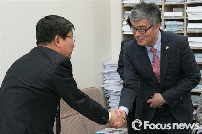 (서울=포커스뉴스) 전해철(왼쪽) 위원장이 27일 오전 서울 여의도 국회에서 법제사법위원회 법안심사제2소위원회 개회 전, 이영(오른쪽) 교육부 차관과 대화하고 있다.