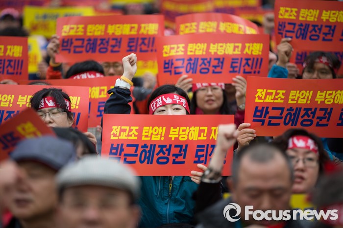 (서울=포커스뉴스) 27일 오후 서울 종로구 정부종합청사 앞에서 전교조(전국교직원노동조합)와 민주교육과 전교조 지키기 전국행동의 주최로 법외노조 후속조치 규탄 및 부당해고 저지, 노동기본권 쟁취를 위한 집회가 열리고 있다.