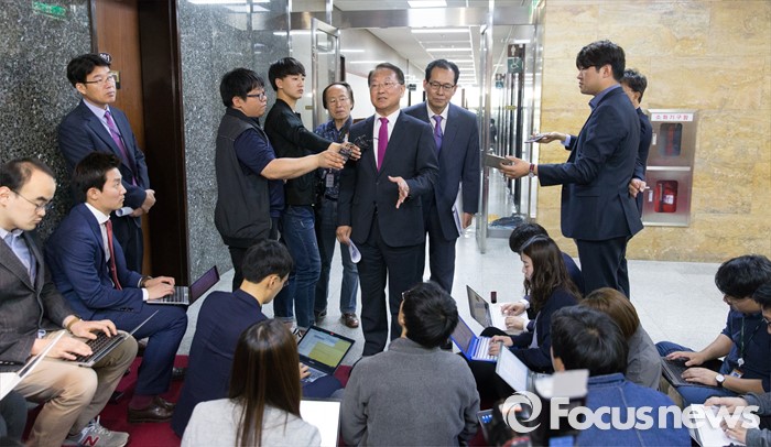 (서울=포커스뉴스) 29일 오전 서울 여의도 국회에서 경제활성화법안 등 처리 요청을 위해 방문한 유일호 경제부총리 겸 기획재정부 장관이 이종걸 더불어민주당 원내대표와 면담을 마치고 취재진 질문에 답하고 있다.