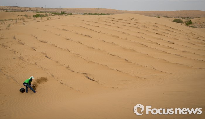 (다라더치/중국=포커스뉴스) 25일 오후 중국 내몽고 다라더치 쿠부치사막에서 2016 미래숲 15기 녹색봉사단원들이 나무 심기 작업을 하고 있다. 미래숲 녹색봉사단은 이번 봉사활동을 통해 황폐화된 사막에 나무 심기 및 각국 청년들과 우호를 증진을 위한 교류 활동을 전개했다.