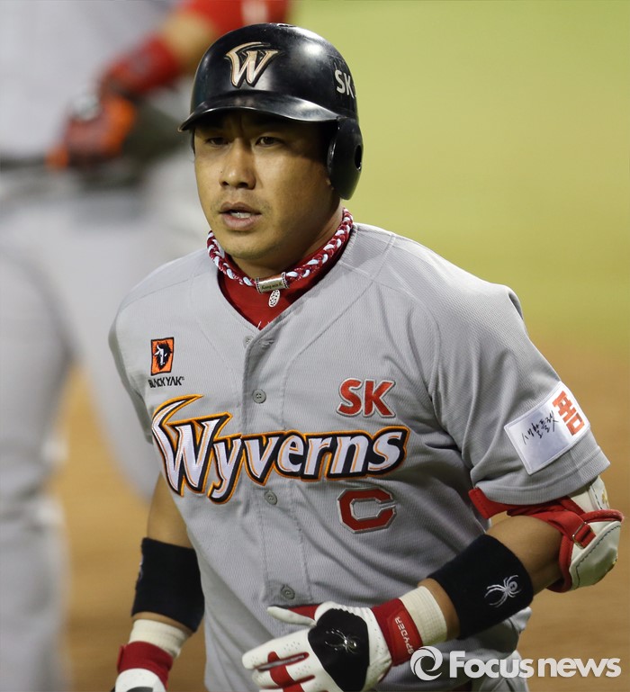 (서울=포커스뉴스) 27일 서울 잠실구장에서 열린 2016 프로야구 SK-두산 경기 5회초 SK 선두타자 김강민이 좌월 솔로 홈런을 치고 홈인하고 있다.