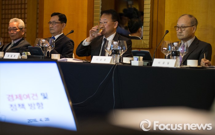 | △ 경제정책 자문 받고 물 마시는 유일호 |