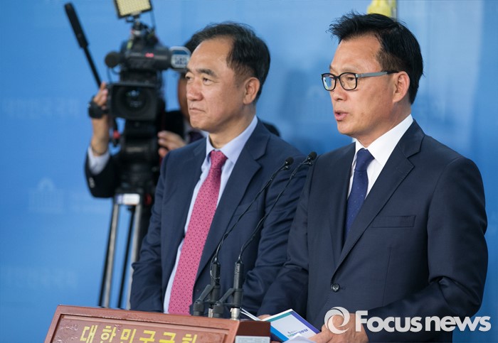 (서울=포커스뉴스) 정장선(왼쪽) 더불어민주당 총무본부장과 박광온 대변인이 27일 오전 서울 여의도 국회 정론관에서 전당대회 일정 등과 관련 브리핑을 하고 있다.