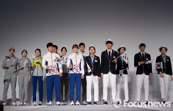 (서울=포커스뉴스) 27일 오후 서울 노원구 태릉선수촌에서 열린 제31회 리우하계올림픽대회 D-100일 미디어데이에서 선수와 모델들이 리우올림픽 국가대표 선수단 단복을 선보이고 있다.