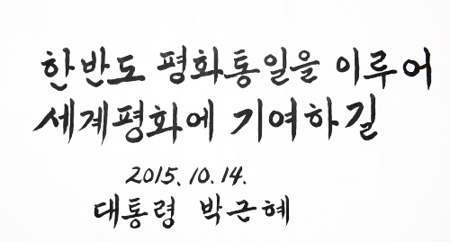 앞서 박 대통령은 지난 2월29일 대통령의 통일철학을 담은 휘호 "한반도 평화통일을 이루어 세계평화에 기여하길"을 통일부에 전달한 바 있다.
