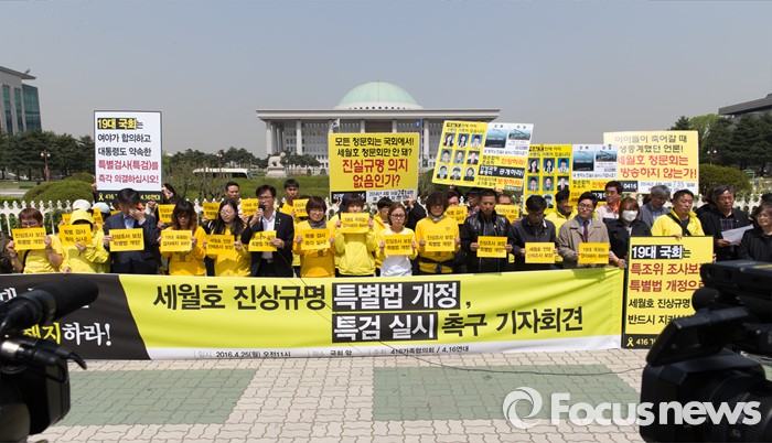 (서울=포커스뉴스) 25일 오전 서울 여의도 국회의사당 정문 앞에서 4월 16일의 약속국민연대 관계자들이 세월호 진상규명 특별법 개정 및 특검 실시 촉구 기자회견을 하고 있다.