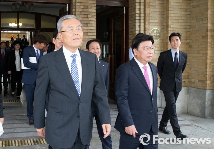 (대전=포커스뉴스) 김종인 더불어민주당 비대위 대표와 이종걸 원내대표를 비롯한 지역 당선인들이 28일 오후 대전 중구 옛 충남도청사를 방문해 청사 방문을 마치고 차량으로 이동하고 있다.