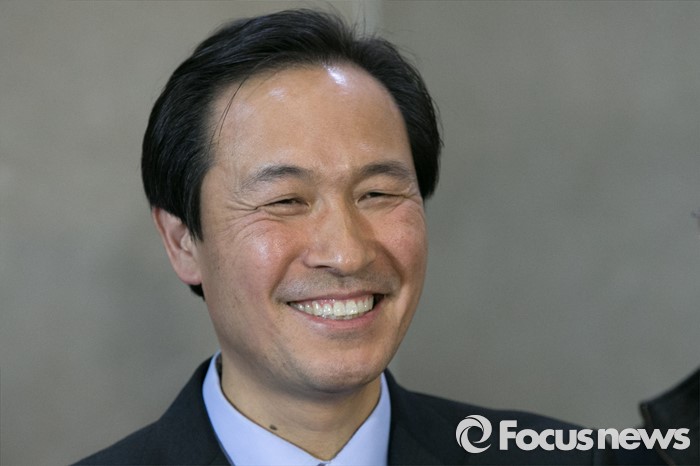 (서울=포커스뉴스) 우상호 더불어민주당 의원이 29일 오후 서울 여의도 국회 정론관에서 당 원내대표 출마 기자회견을 마친 뒤, 환하게 웃고 있다.