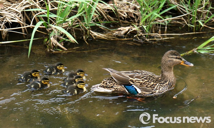 (과천=포커스뉴스) 27일 경기도 과천 양재천에 청둥오리가 갓 부화한 새끼들을 데리고 봄나들이 나왔다. 새끼들은 삐약 삐약 지저귀며 어미 뒤를 따른다.