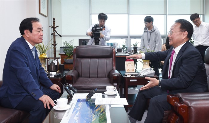(서울=포커스뉴스) 장병완(왼쪽) 국민의당 정책위의장이 29일 오전 서울 여의도 국회 의원회관에서 경제활성화법안 등 처리 요청을 위해 방문한 유일호 경제부총리 겸 기획재정부 장관과 면담에 앞서 악수하고 있다.<사진제공=기획재정부>