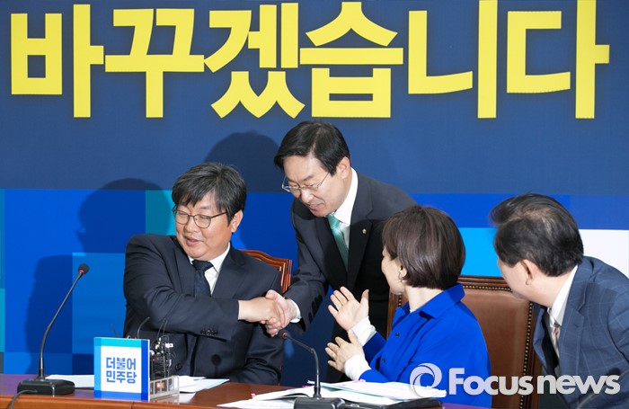 (서울=포커스뉴스) 29일 오전 서울 여의도 국회에서 열린 더불어민주당 보수단체 불법자금지원 의혹규명 진상조사 태스크포스(TF) 1차 회의에 참석한 이춘석(왼쪽부터), 박범계, 진선미 의원, 김병기 당선인이 인사하고 있다.