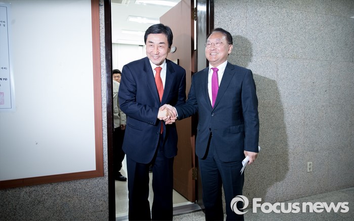 (서울=포커스뉴스) 이종걸 더불어민주당 원내대표가 29일 오전 서울 여의도 국회에서 경제활성화법안 등 처리 요청을 위해 방문한 유일호 경제부총리 겸 기획재정부 장관과 면담을 마치고 마중하고 있다.