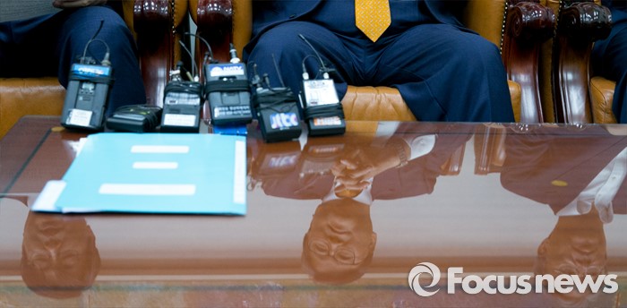 (서울=포커스뉴스) 조원진(가운데) 새누리당 원내수석부대표, 이춘석(왼쪽) 더불어민주당 원내수석부대표, 유성엽 국민의당 원내수석부대표가 27일 오후 서울 여의도 국회에서 19대 마지막 임시국회 의사일정 및 쟁점법안 등 논의를 위한 회동을 하고 있는 모습이 테이블 유리에 반영되어 보이고 있다.