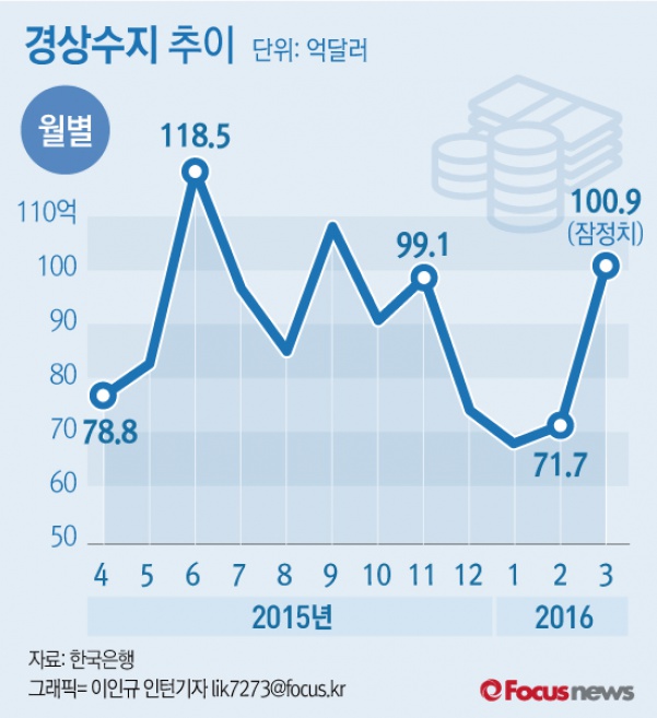 (서울=포커스뉴스) 1일 한국은행이 발표한 3월 국제수지 잠정치 자료에 따르면 3월 경상수지는 전월 대비 29억2000만 달러 늘어난 100억9000만달러를 기록했다. 이는 지난 2012년 3월 이후 49개월 동안 계속된 역대 최장 흑자 기록이다.