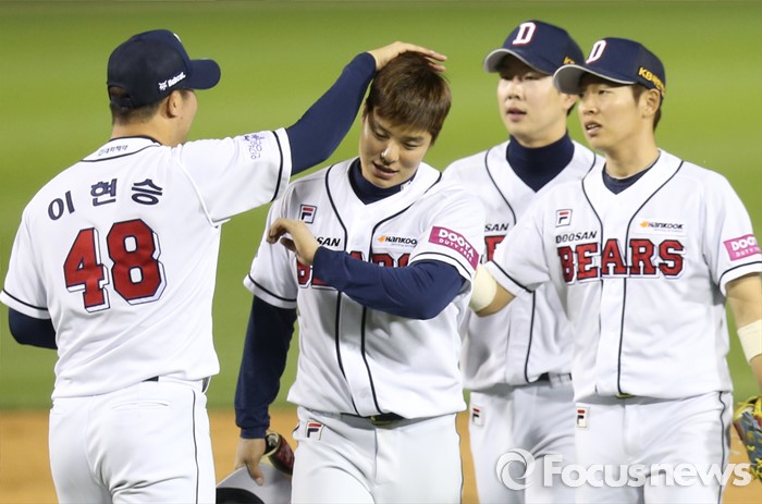 (서울=포커스뉴스) 26일 서울 잠실구장에서 열린 2016 프로야구 SK-두산 경기에서 두산의 승리를 지킨 마무리 투수 이현승이 우익수 민병헌의 머리를 쓰다듬고 있다.