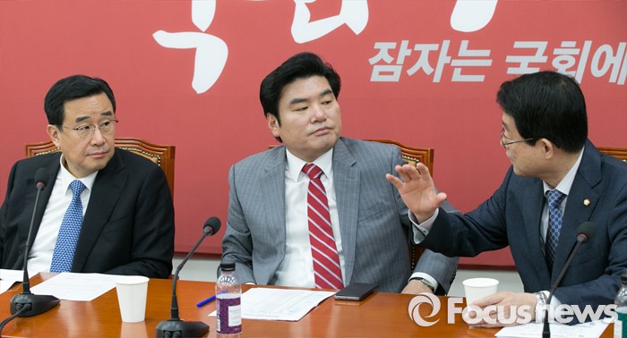 (서울=포커스뉴스) 정희수(오른쪽) 기재위원장이 25일 오전 서울 여의도 국회에서 열린 새누리당 상임위원장 · 간사단 연석회의에 참석해, 원유철(가운데) 원내대표, 김정훈 정책위의장과 대화하고 있다.