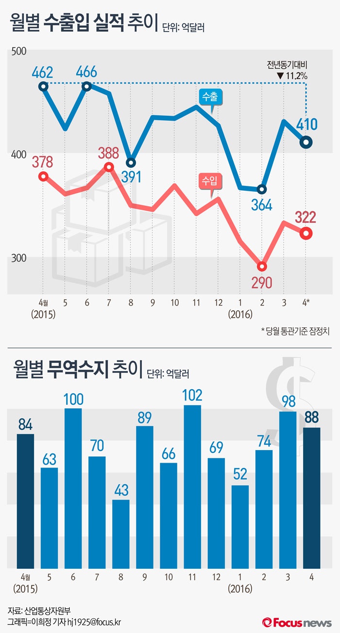 (서울=포커스뉴스) 1일 산업통상자원부가 발표한 '2016년 4월 수출입동향'에 따르면 4월 수출액은 410억달러로 전년동월대비 11.2% 감소를 기록했다. 수입액은 지난해 같은 기간보다 14.9% 줄어든 322억달러, 무역수지는 88억달러였다.