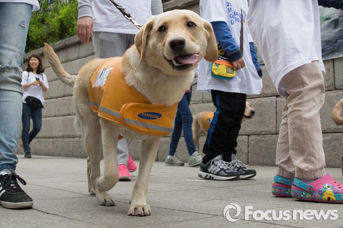 (서울=포커스뉴스) 27일 오전 서울 청계천에서 삼성화재안내견학교 훈련사들과 안내견들이 시민들과 함께 '안내견과의 만남' 행사를 하고 있다.
