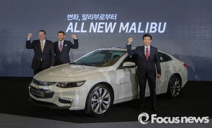 (서울=포커스뉴스) 27일 오전 서울 구로구 고척스카이돔에서 열린 한국지엠 '올 뉴 말리부' 신차 발표회에서 제임스 김(오른쪽) 한국지엠 사장과 쉐보레 관계자들이 신차 발표를 축하하며 취재진을 향해 포즈를 취하고 있다.