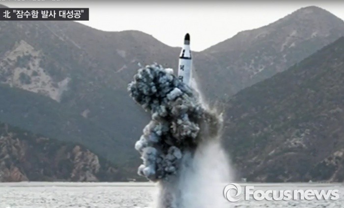 (서울=포커스뉴스) 북한이 24일 동해안 신포항 인근에서 SLBM(잠수함발사탄도미사일)발사에 성공했다고 북한 조선중앙TV를 통해 발표하고 있다.