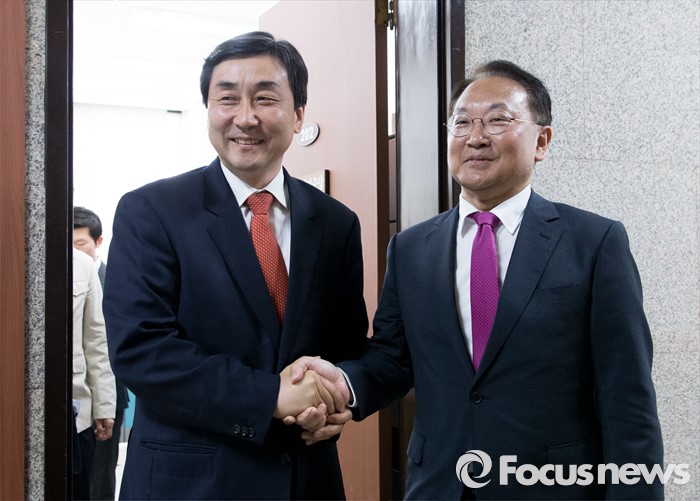 (서울=포커스뉴스) 이종걸 더불어민주당 원내대표가 29일 오전 서울 여의도 국회에서 경제활성화법안 등 처리 요청을 위해 방문한 유일호 경제부총리 겸 기획재정부 장관과 면담을 마치고 마중하고 있다.