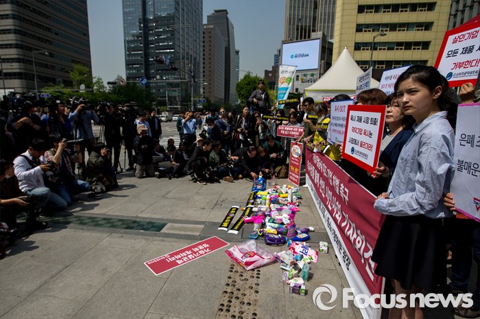 (서울=포커스뉴스) 25일 오전 서울 종로구 광화문 광장에서 옥시 가습기 살균제 피해 가족 및 환경단체 관계자들이 옥시 상품 불매를 촉구하는 기자회견을 하고 있다.