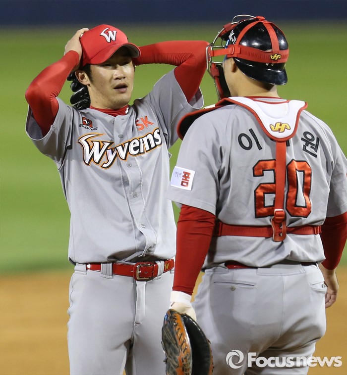(서울=포커스뉴스) 27일 서울 잠실구장에서 열린 2016 프로야구 SK-두산 경기 5회말 1사 1,2루에서 SK 포수 이재원이 마운드에 올라가 투수 박종훈을 격려하고 있다.